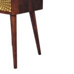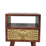 This Eden Mini Bedside is made of solid mango wood, with a chestnut finish structure. It has 1 drawer and 1 open shelf for convenient storage space and ample space on top to display a photo frame, candle or lamp. Additionally, the exquisite craftsmanship and beautiful gold brass sheet provide a beautiful carved pattern on the drawer fronts making this an all-round eye-catching piece of furniture in your bedroom