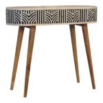 This beautiful boho inspired console table has been constructed from 100% solid mango wood and has a fine oak-ish finish. Other features include 2 bone inlay front drawers, and Nordic style legs. The bone inlay is sourced responsibly from deceased animals such as camels, goats, and buffaloes.