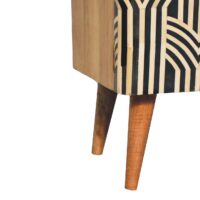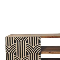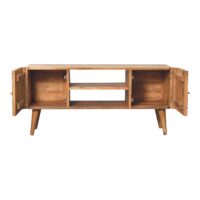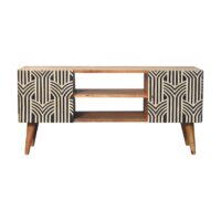 This beautiful boho-inspired media unit has been constructed from 100% solid mango wood and has a fine oak-ish finish. Other features include 2 open slots and 2 bone inlay front cabinets as well as Nordic-style legs. The bone inlay is sourced responsibly from deceased animals such as camels, goats, and buffaloes.
