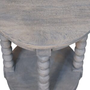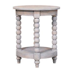 Charming in its curvature and timeless in design, the Ellsworth Round Side Table brings vintage elegance into the modern home. Crafted from 100% solid mango wood and finished in a soft acid wash, it features hand-turned spindle legs and a circular lower shelf for added storage or styling. Whether placed beside a sofa or bed, this side table adds character, warmth, and a touch of craftsmanship to any corner.