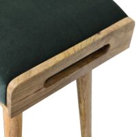 This footstool features a tray-style design and 4 Nordic-style legs constructed from 100% solid mango wood. It has been upholstered in an emerald green cotton velvet which works as a comfortable seat and can be incorporated into many different interior styles as it offers a very clean and modern design, along with providing a nice contrast between the material and wood.