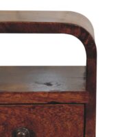 This ultra-compact bedside table is a versatile addition to any space, perfect as a spot for snacks, drinks, or a small lamp. Crafted from 100% solid mango wood with a warm chestnut finish, it features softly curved edges, one convenient drawer, an open storage slot, and four Nordic-style legs. Part of our Recession Collection, this stylish piece offers functionality and charm for smaller spaces.