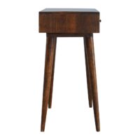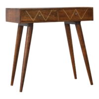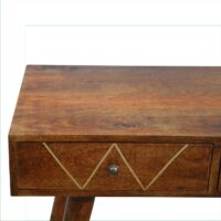 Inspired by a vintage design, this solid wood console table provides ample space. It is constructed from 100% solid mango wood and has a fine chestnut finish. Other features a decent-sized table top and 2 drawers with gold brass which provide discreet storage. The perfect addition to any home or office environment.