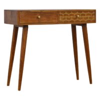 Inspired by a vintage design, this solid wood writing desk provides ample space for you to work on. It is constructed from 100% solid mango wood and has a fine chestnut finish. Other features a decent-sized table top and 2 drawers with a gold brass pattern and shiny knobs. The perfect addition to any home or office environment, with a clean design to suit most interiors.