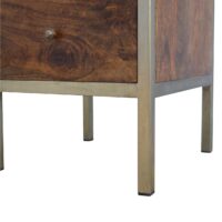 Enjoy the minimalistic design of this bedside constructed in solid wood, with a iron frame in a beautiful gold brass finish and 2 drawers in a chestnut finish to take care of everyday utility items. This bedside table will add a definite and lasting character to your bed or living room.