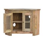 This beautiful corner media unit is constructed from 100% mango wood in a fine hand-distressed oak-ish finish along with 2 shiny knobs, to give it that country charm style. It has 2 glazed doors with a shelf placed inside, to display things such as ornaments and pictures, etc.