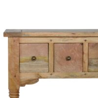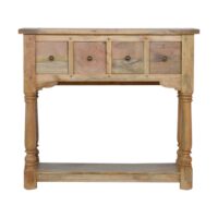 The perfect piece of furniture for any living space is this narrow console table, which is constructed from 100% solid mango wood and is hand distressed with an oak-ish finish. It has features such as hand-turned legs, four drawers that come with shiny handles, and a lower shelf for extra storage.