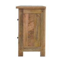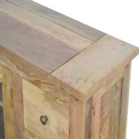 Our solid timber media unit is expertly constructed from 100% solid mango wood, and has fine hand distressed oak-ish finish and simple design to suit most homes. This piece features carefully farm house feet, and handles to the four drawers and two glazed doors that has a shelf placed inside.