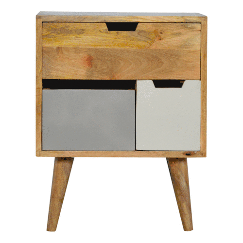 This mini handy Nordic bedside has been constructed from 100% solid wood. It features 1 cut out solid wood drawer and 2 removable grey gradient hand painted drawers which can be switched around. It can stand alone or be partnered with the other grey painted pieces from the range for a completed look. The perfect addition to the living room or bedroom.