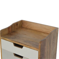 This bedside table makes a perfect stand for nibbles, drinks or a lamp. It has been constructed from 100% solid mango wood with a fine oak-ish finish body. It also features 3 grey gradient, hand painted cut-out drawers and 4 Nordic style legs. A lovely addition to the home.