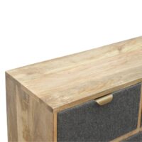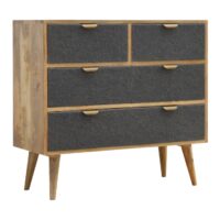 Finished with fabric front drawers, and upholstered in a grey tweed to match perfectly with the fabric front writing desk, this chest takes a different twist on furniture with the contrast of 2 materials and combining them together. It features a solid wood body finished in an oak-ish finish and a golden pull-out handle with 4 Nordic style legs. It is the perfect addition to both modern and country homes. It has 2 large drawers and 2 smaller drawers for storing your clothes or any belongings neatly in the bedroom.