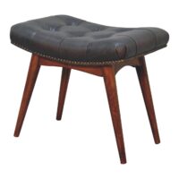 Inject character into your living space with this modern black footstool. The legs and frame are constructed from 100% solid mango wood in a chestnut finish and the seat is upholstered in black buffalo leather with a deep button design, this piece will offer relaxation, making it both comfortable and beautiful in the home.