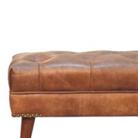 Inject character into your living space with this modern brown leather bench. The legs are constructed from 100% solid mango wood in a chestnut finish and the seat is upholstered in olive green buffalo leather with a deep button design, this piece will offer relaxation, making it both comfortable and beautiful in the home.