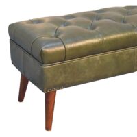 Inject character into your living space with this modern green bench. The legs are constructed from 100% solid mango wood in a chestnut finish and the seat is upholstered in olive green buffalo leather with a deep button design, this piece will offer relaxation, making it both comfortable and beautiful in the home.