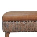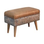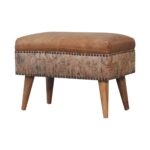 Featuring a durrie acid wash printed rim with a buffalo leather hide seat, this square footstool has solid mango wood legs that have an oak-ish finish, ensuring it is stable and durable in the home and provides a beautiful contrast with shiny brass studs on the rims, it is a multi functional meaning it can be used both in the living room and bedroom.