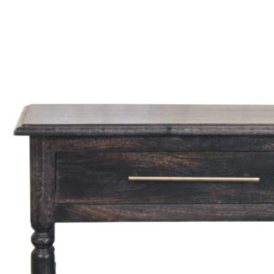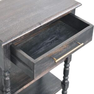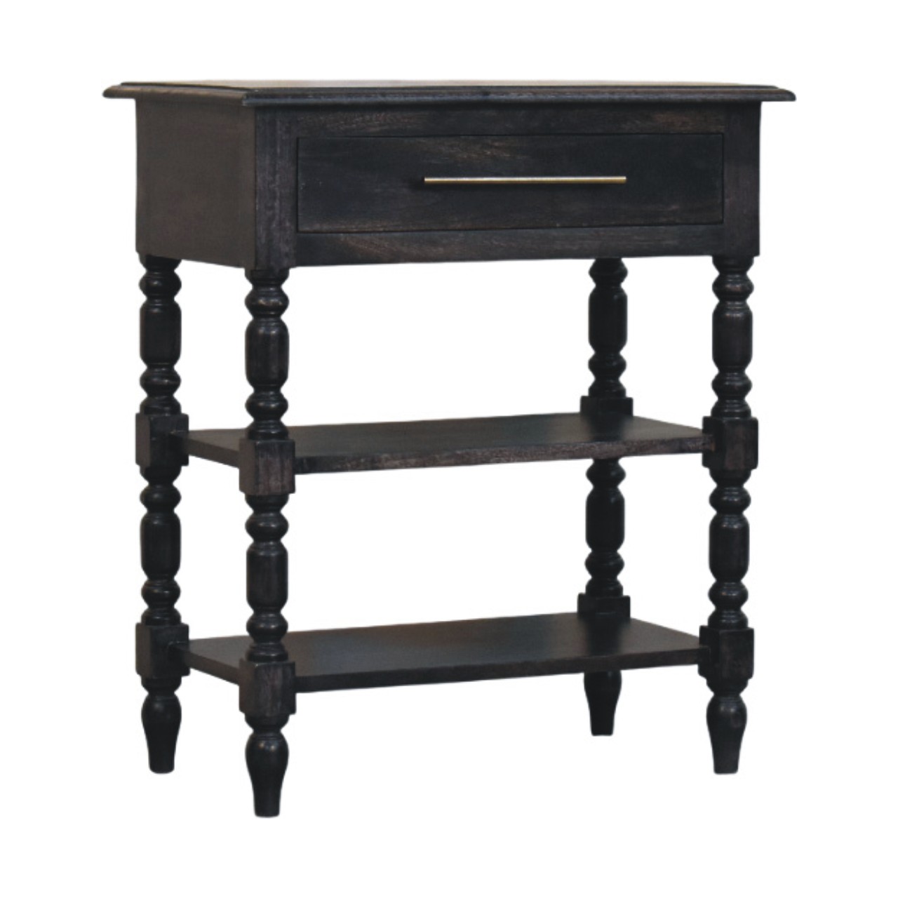 Blending classic elegance with functional form, this side table is crafted from 100% solid mango wood in a dramatic carbon ash finish. It features turned legs that exude timeless charm, one smooth-glide drawer with a sleek brass-finished handle, and two open shelves ideal for storing books, baskets, or daily essentials. Perfect as a nightstand or a hallway accent, this piece pairs heritage detailing with practical design, offering depth and sophistication to any living space.