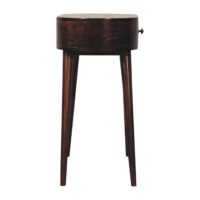 This solid wood console table has been constructed from 100% solid mango wood in a california walnut finish and offers a unique shaped design with rounded edges. It features one small drawer with a shiny knob and Nordic style legs. A great, simple addition to the home.