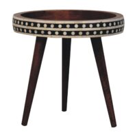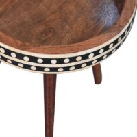 This solid wood end table has made from 100% mango wood in a fine honey caramel finish. The no-fuss finish reveals the beautiful grain of the mango wood which this piece of furniture is made of. This tripod table stands on Nordic style legs and features a black and white bone inlay pattern on the edges. The bone is sourced responsibly from deceased animals such as camels, goats, and buffaloes.
