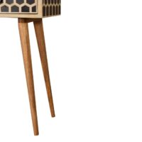 This console table has a clean and simple design to suit most homes. It has a lovely oak-ish finish and features 2 bone inlay drawer draws that have a honeycomb pattern and 2 glass knobs. Some other features include 4 Nordic-style legs. The bone inlay is sourced responsibly from deceased animals such as camels, goats, and buffaloes.
