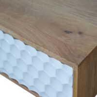 This stunning honeycomb hand carved coffee table will add a stylish and contemporary vibe to your home. Constructed from 100% solid mango wood in an oak-ish finish it features 1 white honeycomb hand painted sliding door and stands on 4 Nordic style legs, it is bound to be a statement in the bedroom.