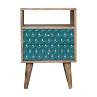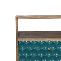 This stunning hand-carved honeycomb bedside table will add a stylish and contemporary vibe to your home. Constructed from 100% solid mango wood in an oak-ish finish it features 2 teal hand-painted drawer fronts and 1 open slot for convenient storage. It stands on 4 Nordic-style legs and makes a great statement piece for the bedroom.