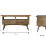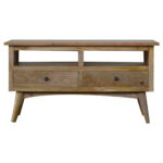 Our solid timber media unit is expertly constructed from 100% solid mango wood, and has a clean and simple design to suit most homes. This piece has a lovely oak-ish finish and features carefully handcrafted joints, wooden runners and brass handles to the two drawers. It is carefully finished in a durable lacquer, to help protect and enhance the look of this solid oak piece of furniture.