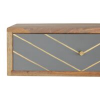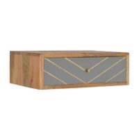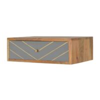 This minimalistic wall-mounted bedside has been constructed from 100% solid mango wood in an oak-ish finish and features 1 cement brass inlay pattern drawer with a shiny knob. This piece is perfect for storing any bits and pieces you wish to keep close by before bedtime. Its neat and clean design can easily be mounted on the wall without the fuss of any legs. Caution! Do not sit on the unit.