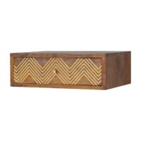 This minimalistic wall-mounted bedside has been constructed from 100% solid mango wood in a chestnut finish and features 1 brass-inlay chevron pattern drawer with a shiny knob. This piece is perfect for storing any bits and pieces you wish to keep close by before bedtime. Its neat and clean design can easily be mounted on the wall without the fuss of any legs. Caution! Do not sit on the unit.
