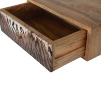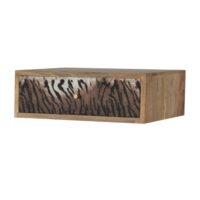 Introducing Animal Print. This wall-mounted bedside will take your bedroom to another level. Constructed from 100% solid mango wood in a fine oak-ish finish, the main feature being the drawer has a beautiful tiger animal print drawer finished with a shiny knob giving the whole piece extra character.