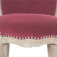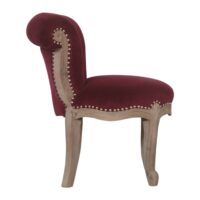 Add class and style to your home with this occasional chair. The upholstered wine red cotton velvet fabric goes beautifully with the studded design giving the piece an overall unique and chic look. With solid wooden legs constructed from 100% solid mango wood in an Acid-wash finish, the chair provides strength and durability and can be incorporated into different home settings and interiors.