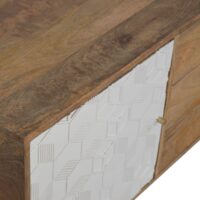 This stunning piece has been constructed from 100% solid mango wood and features nordic style legs. It provides useful storage with the space of 3 drawers and a cabinet finished with shiny brass knobs. The white cube design is partnered nicely with the finish of the wood giving an overall modern and chic look.