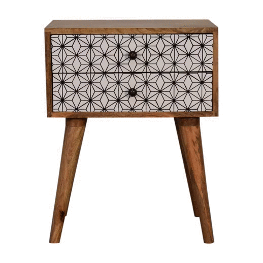 This 2 drawer bedside has been constructed from 100% solid mango wood and finished in a fine oak-ish finish body. The main feature of this piece are the screen printed drawer fronts which have a beautiful black and white geometric design giving the piece extra dimension and character. It also has 4 Nordic style legs and ample space on top for a lamp, photo frames or ornaments.
