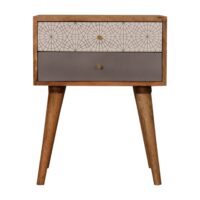 This bedside table is the perfect stand for any bits and pieces you wish to keep nearby before bedtime. It features ample space for a lamp, photo frame or any ornaments. It has been constructed from 100% solid mango wood with a fine oak-ish finish body with one grey and one patterned drawer. A lovely pop of colour and addition to the home.