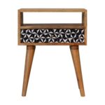This bedside has been constructed from 100% solid mango wood and finished in a fine oak-ish finish body. It features a black and white pattern drawer front which is bound to uplit your bedroom and allow you to store any bits and pieces discreetly along with a open slot for extra stroage. It also has 4 Nordic style legs and ample space on top for a lamp, photo frames or ornaments.