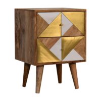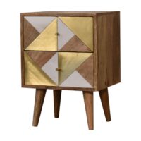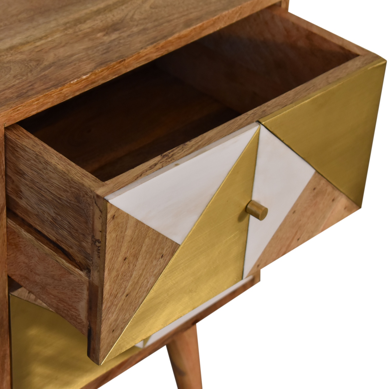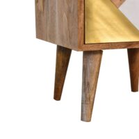 Providing an elegant touch to a bedroom, this 100% solid mango wood cabinet has an oak-ish finish and has been given a clear lacquer for extra durability, it features 2 drawers that have a combination of mango wood, brass sheet, and acrylic (faux) marble. Other features include shiny brass knobs and nordic style legs.