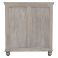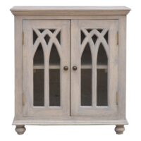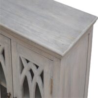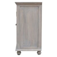 This sideboard is made from 100% solid mango wood and has smooth acid wash stone finish. This product offers excellent storage space with 2 drawers and 2 glazed door cabinets which have a solid wood pattern, and a decent size top to place pictures and special ornaments etc. Other features include 4 bun feet, round knob handles made from brass metal and a thick top. Add this stunning sideboard to your home.