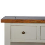 Bring a whole new look to your kitchen with this kitchen unit , it features a white hand spray painted base which is constructed from solid mango wood and a rich honey finish top which is constructed from solid acacia wood. It has 3 drawers, and 1 door cabinet. Other features include straight farm house feet, shiny brass knob handles and the drawer inners and shelves have a rich honey finish. A superb piece of furniture to look at that is also highly functional.
