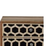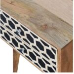 This bedside features a stylish and modern design. The beautiful bone inlay design stands out and will give your home a classy and sophisticated vibe. It has been constructed from 100% solid mango wood in an oak-ish finish with Scandinavian-style legs. With 2 drawers it is perfect for storing small household items. The bone inlay is sourced responsibly from deceased animals such as camels, goats, and buffaloes.