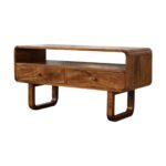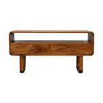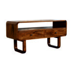 This chestnut media unit is the perfect piece for keeping your living room tidy, with 2 drawers and a large open slot it enables plenty of storage space in the home. A take on the original curved chestnut media unit, this new design features u-shape legs. It is constructed from 100% solid mango wood in a chestnut finish.