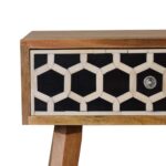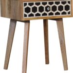This bedside features a stylish and modern design. The beautiful bone inlay design stands out and will give your home a classy and sophisticated vibe. It has been constructed from 100% solid mango wood in a oak-ish finish with tapered legs. The bone inlay is sourced responsibly from deceased animals such as camels, goats, and buffaloes.