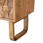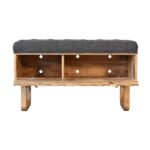 The hand-carved door front is the characteristic that distinguishes the pieces in this collection. This piece has an upholstered grey tweed top and is constructed from 100% solid mango wood with an oak-ish finish. Its style is versatile and can fit into a variety of homes, so it may be paired with other items from the collection or used alone.