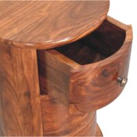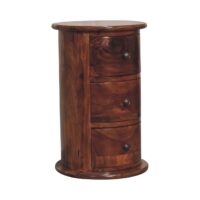 This beautiful round three-drawer drum chest is made from 100% Sheesham wood and has a fine honey with shiny knobs on the drawers. The three spacious drawers are perfect for storing small items and the space on top is perfect for displaying plants, candles, or photos. This product can be used as either a chest, end table or an occasional table in the home