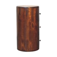 This beautiful round three-drawer drum chest is made from 100% solid mango wood and has a fine chestnut with shiny knobs on the drawers. The three spacious drawers are perfect for storing small items and the space on top is perfect for displaying plants, candles, or photos. This product can be used as either a chest, end table, or an occasional table in the home