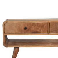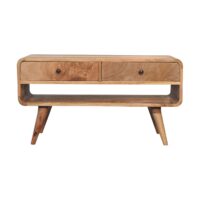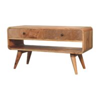 Introducing our reverse solid timber media unit, it is expertly constructed from 100% solid mango wood in a lovely oak-ish finish. This modern design offers clean, curved edges and features 2 drawers that come with a shiny knob, a large open slot to place any books, photo frames, or ornaments, and 4 Nordic style legs.