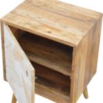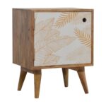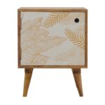 Introducing our leaf print design, this bedside table has been constructed from 100% solid mango wood with a screen printed door front which has a white background and a subtle golden leaf design. It features 4 Nordic style legs and one door with 2 shelves inside for discreetly storing any bits and pieces before bedtime and a round open slot for access into the shelves. The perfect, modern piece of furniture which can be used as an accent piece in any style of interior and home.