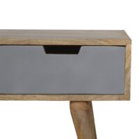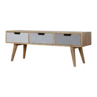 This solid timber media unit is expertly constructed from 100% solid mango wood in an oak ish finish. Has a clean and simple design to suit most homes. It features drawers that are hand spray painted in 3 different tones of grey, some other features include 4 Nordic style feet and a decent-sized table top to place a TV.