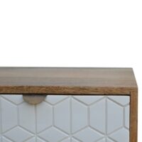 This carved bedside table is the perfect addition to add to any bedroom. It will prove handy all over your home and is made from 100% solid mango wood with a fine oak ish finish. The main feature of the piece is the white painted drawer that stands on 4 Nordic style legs.