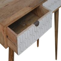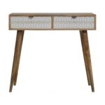 This 2 Drawer console table has been constructed from 100% solid mango wood and has been finished with an oak-ish finish body. The main features of this piece are the white-painted carved drawer fronts which have a beautiful white design giving the piece a nice contrast between the wood and the design. The spacious drawers can be used to store any bits and pieces in the hallway. It also has 4 Nordic-style legs and a good-sized tabletop to work or study on.