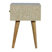 This bedside table has been constructed from 100% solid mango wood features a drawer decorated with a floral bone inlay design and has been delicately painted in a grey colour with an Oak ish finish base and Nordic style legs. It has 1 spacious drawer for keeping any easy-to-reach bits and pieces and can either be partnered with the other pieces from the range or can look good as a standalone piece partnered with another bedside.