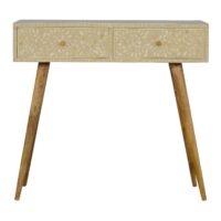 The handy console table has been constructed from 100% solid mango wood and features 2 spacious drawers decorated with a floral bone inlay which has been painted in a grey colour and finished with an oa-ish finish base and legs. It can be used as an accent piece in the home or be partnered with the other bone inlay pieces.